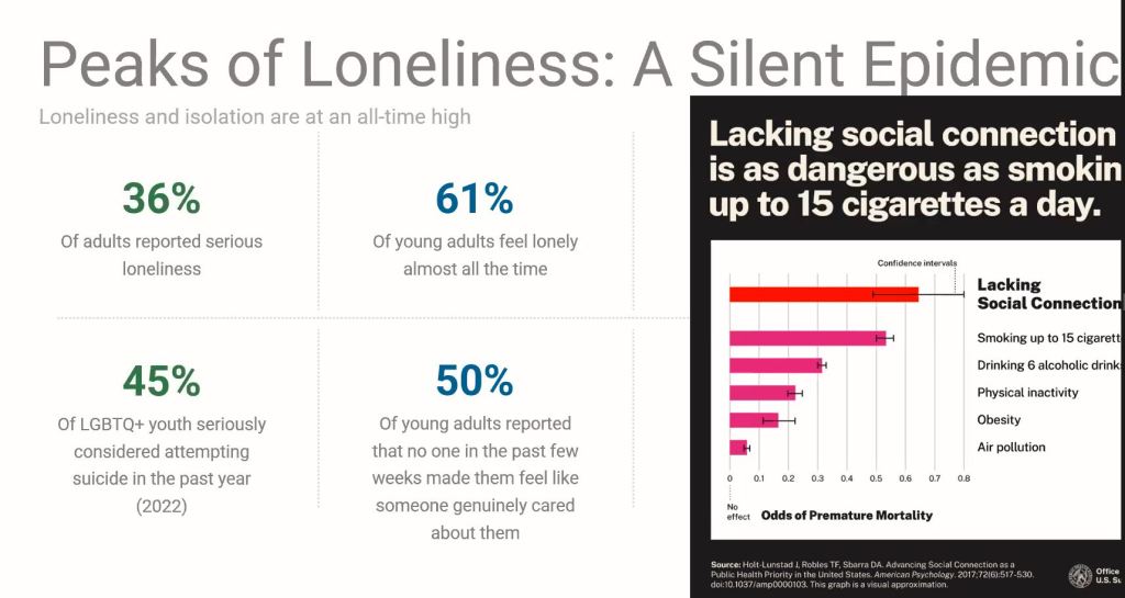 According to the U.S. Department of Health, loneliness increases the risk of heart disease by 29% and stroke by 32%; it also heightens the chance of dementia in older adults by a startling 50%. Lacking social connection boosts the risk of premature death by over 60%.